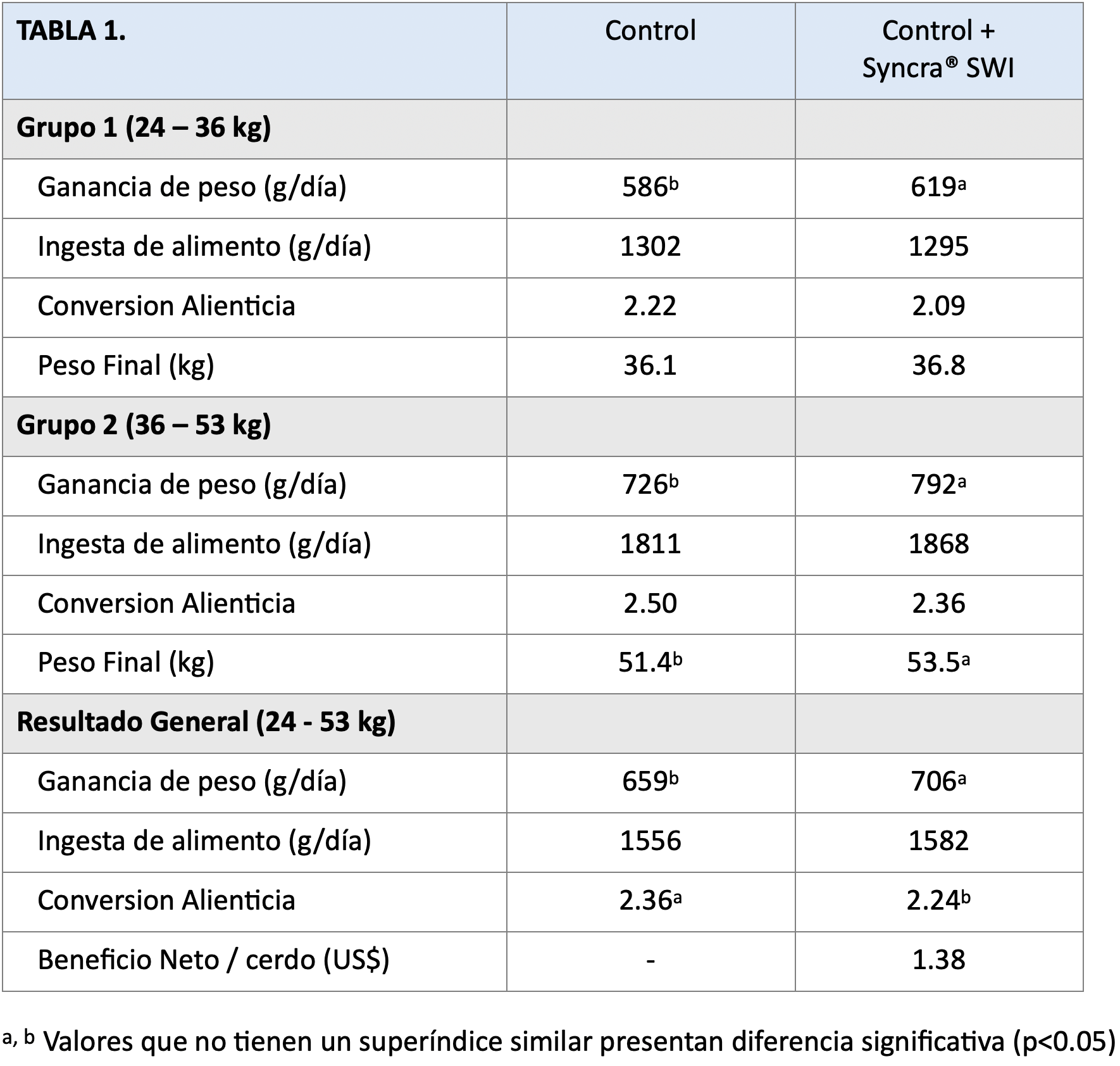 Resultados. Durante la fase 1 (23-36 kg), Syncra® SWI mejoró significativamente (P<0.05) la ganancia de peso corporal en un 5.6 % en comparación con el grupo control. Y durante la fase 2 (36-53 kg), Syncra® SWI mejoró significativamente (P<0.05)  en un 9.1 %.   El peso corporal final mejoró significativamente (P<0.05) en un 4.1% con Syncra® SWI. (Tabla 1)