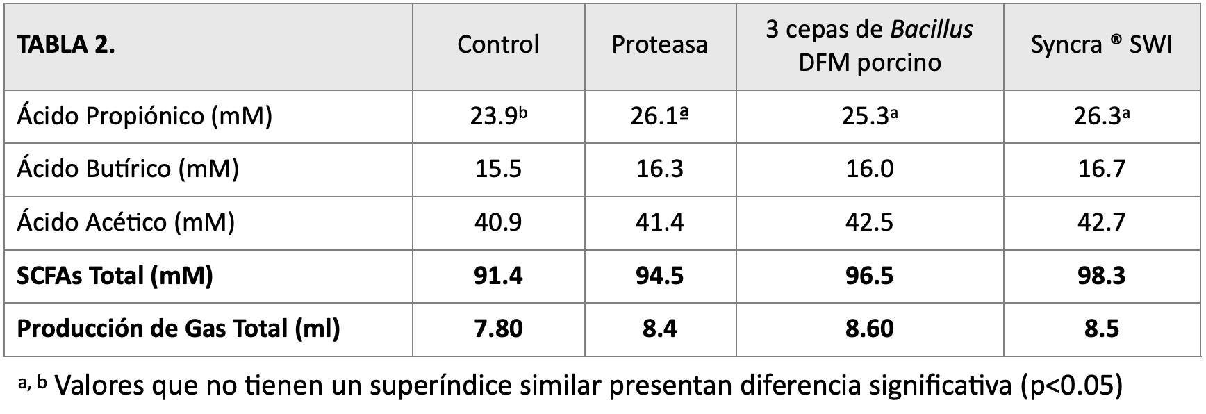 Resultados.  La producción de ácido propiónico presentó una mejora significativa del 10% (p=0.07) con la adición de Syncra® SWI comparado con el grupo control.  Asimismo, presentó una mejora numérica del 0.8% (p>0.10) y del 4% comparado con proteasa y 3 cepas de Bacillus DFM porcino, respectivamente.