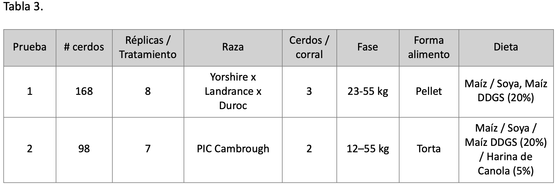 Diseño de la prueba. En las instalaciones de la Universidad de Dankook (Corea del Sur) y la Universidad de Minnesota (EE.UU.), 266 cerdos del tipo Yorshire x Landrace x Duroc (de entre 15 – 23 kg) fueron asignados aleatoriamente a 07 tratamientos de alimento, con entre 7 u 8 réplicas por tratamiento (2/3 cerdos/corral) Tabla 3).