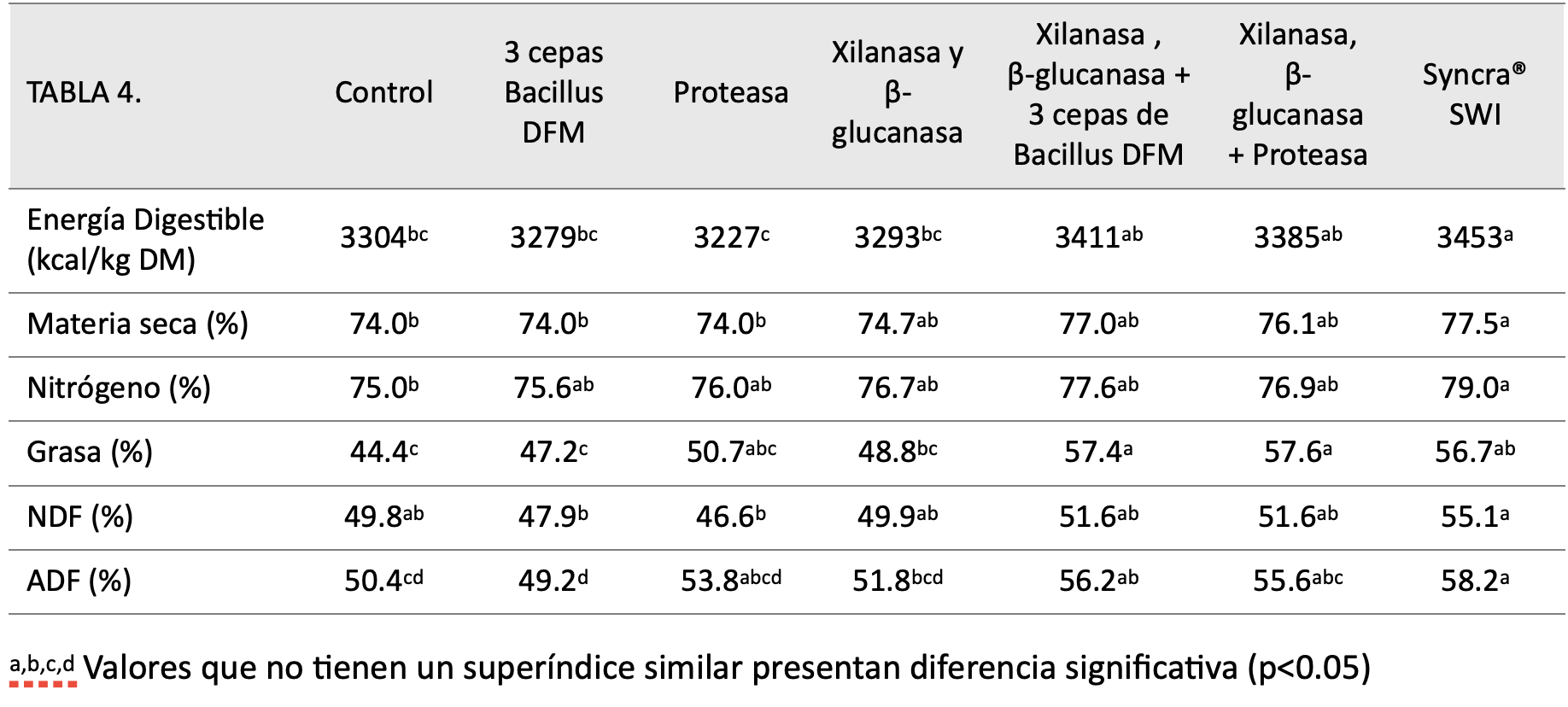 Resultados.  Con la adición de Syncra® SWI, la energía digestible mejoró significativamente (p<0.05) en 149 kcal/kg DM (4.5%) vs la dieta control; 174 kcal/kg DM (5.3%) vs dieta suplementada con 3 cepas de Bacillus DFM; 226 kcal/kg DM (7.0%) vs la dieta suplementada con proteasa; y 160 kcal/kg DM (4.9%) vs la dieta suplementada con xilanasa y β-glucanasa.  Asimismo, el análisis mostró una mejora numérica de energía digestible de 42 kcal/kg DM (1.2%) y de 68 kcal/kg DM (2.0%), en comparación con los tratamientos xilanasa, β-glucanasa + 3 cepas de Bacillus DFM y xilanasa, β-glucanasa + proteasa, respectivamente. (Tabla 4)