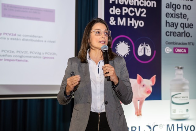 A continuación, Juliana Calveyra profundizó en las características técnicas de Cirbloc Mhyo, explicando cómo su formulación de última generación permite obtener una respuesta inmune potente, estable y homogénea en los animales. Presentó resultados de estudios de campo donde la vacuna ha demostrado mejoras en parámetros clave como ganancia de peso, conversión alimenticia, uniformidad y reducción de mortalidad. También resaltó que la vacunación combinada facilita los procesos en granja, reduce el estrés en los animales y contribuye a una producción más eficiente.